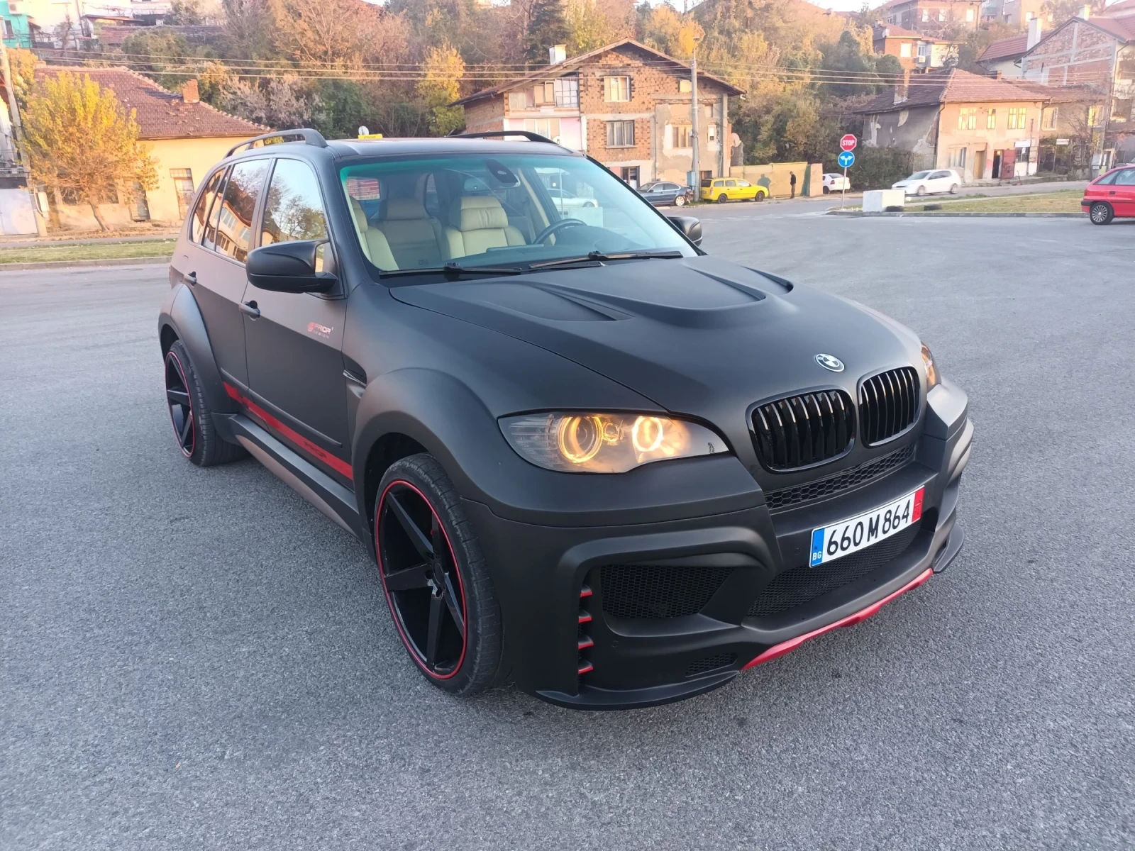 BMW X5 3. 0d | M57 235 к. с. | 6HP автоматик | PRIOR DESIGN тунинг | 08. 2007 г. Това не е обикновена X5-ца, а единствена по рода си в България с професионален тунинг от немската фирма PRIOR Design. Автомобилът е в отлично техническо състояние двигателят и скоростната кутия работят безупречно, върви много стегнато и мощно. Най-вероятно има ремап. Джипът е оборудван с 22-инчови джанти Veesmann предни 10J / задни 12J, с нови гуми и фланци H&R. Права генерация от неръждавейка с крайно гърне Max Performance и Active Sound System (1200 евро) с възможност за избор на звук през телефон (V8,