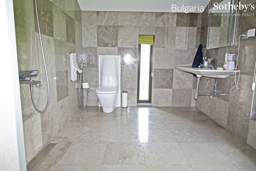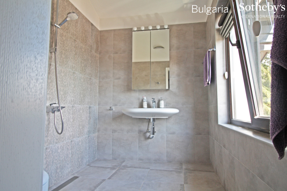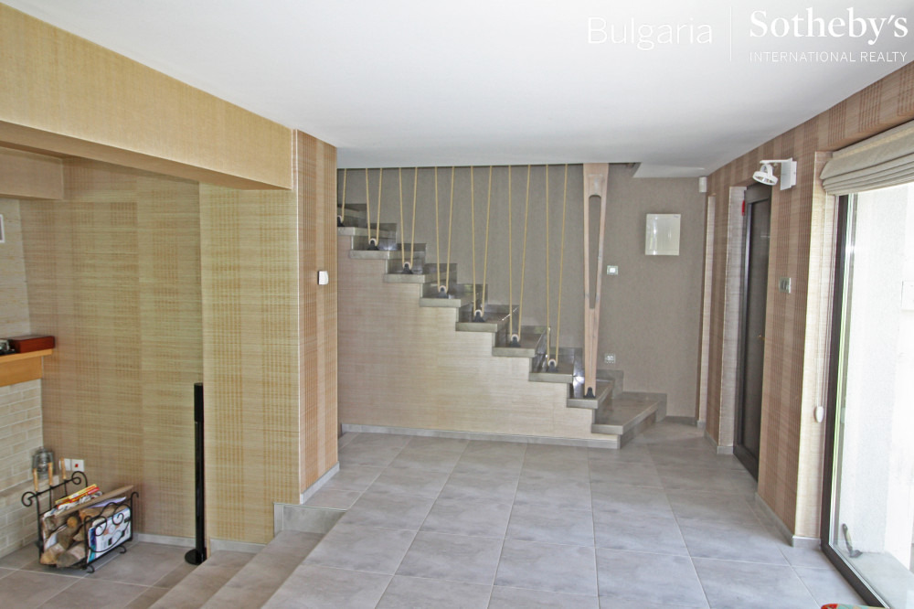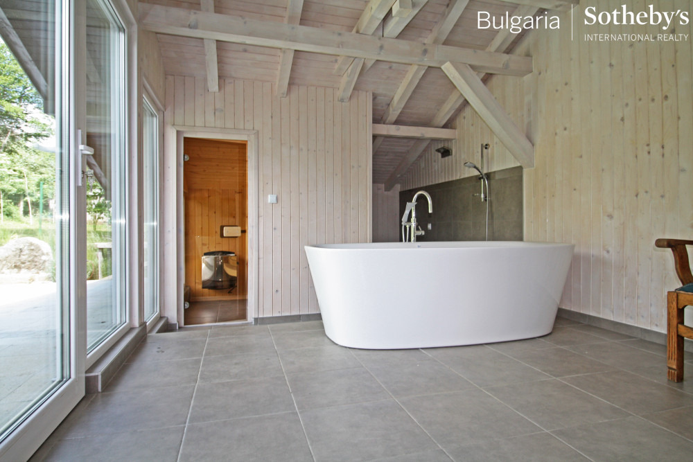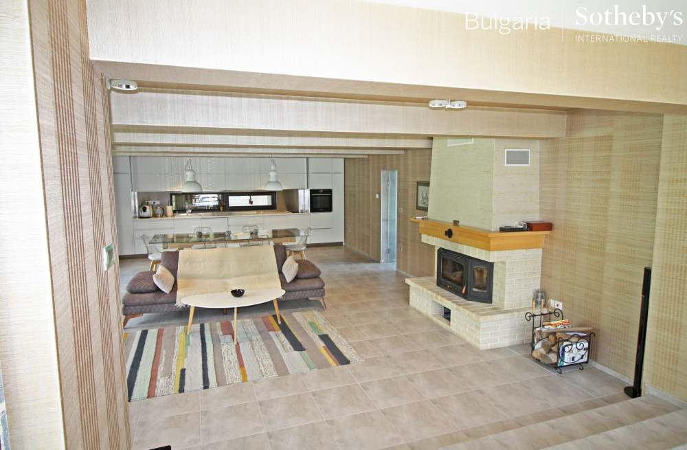 Първи етаж: слънчев и обширен хол с камина, кухненски бокс , трапезарна част, баня. Кът за релакс със сауна и вана.