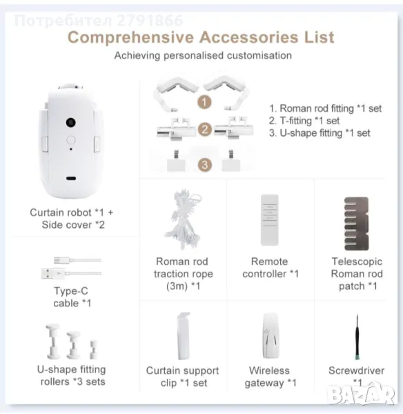 - Аксесоари за продукти: Всеки комплект интелигентно отваряне на завеси включва: робот за завеси*1 + страничен капак*2, Type-C кабел *1, дистанционно управление *1, безжичен шлюз *1, Т-образен фитинг *1 комплект, U-образен фитинг *1 комплект + U-образни монтажни ролки *3 комплекта, аксесоар за римска пръчка *1 комплект, телескопична лепенка за римска пръчка *1, опора за щипка за плат за завеса *1 комплект, теглещо въже за римска пръчка *1 (3m), отвертка *1, осигурявайки ви цялостно решение за завеси.