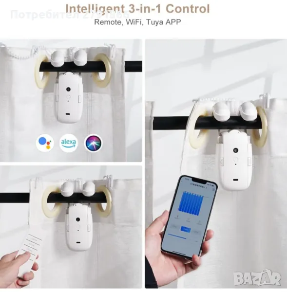 - Интелигентно управление 3 в 1: Автоматичното отваряне на пердета поддържа интелигентно управление 3 в 1 чрез дистанционно управление, WiFi и приложението Tuya. С помощта на приложението можете лесно да планирате време за включване/изключване, да активирате безшумен режим и да приложите интелигентно управление въз основа на сензори за температура и светлина. След като конфигурирате шлюза за контролера за завеси, можете да постигнете гласов контрол чрез Amazon Alexa, Google Assistant и Siri, осигурявайки ви по-удобен начин на живот.