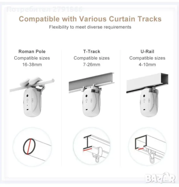 - Съвместимост с много канали: Инсталирането на двигателя за перде е лесно и удобно – просто го окачете, монтирайте страничния капак и адаптера и изберете метода на управление. Съвместим е с различни релси, включително римски стълб (16-38 mm), T-релса (7-26 mm) и U-релса (4-10 mm). Независимо от типа релса, която използват вашите завеси, устройството за отваряне на завеси може лесно да се адаптира, осигурявайки ви цялостно потребителско изживяване.