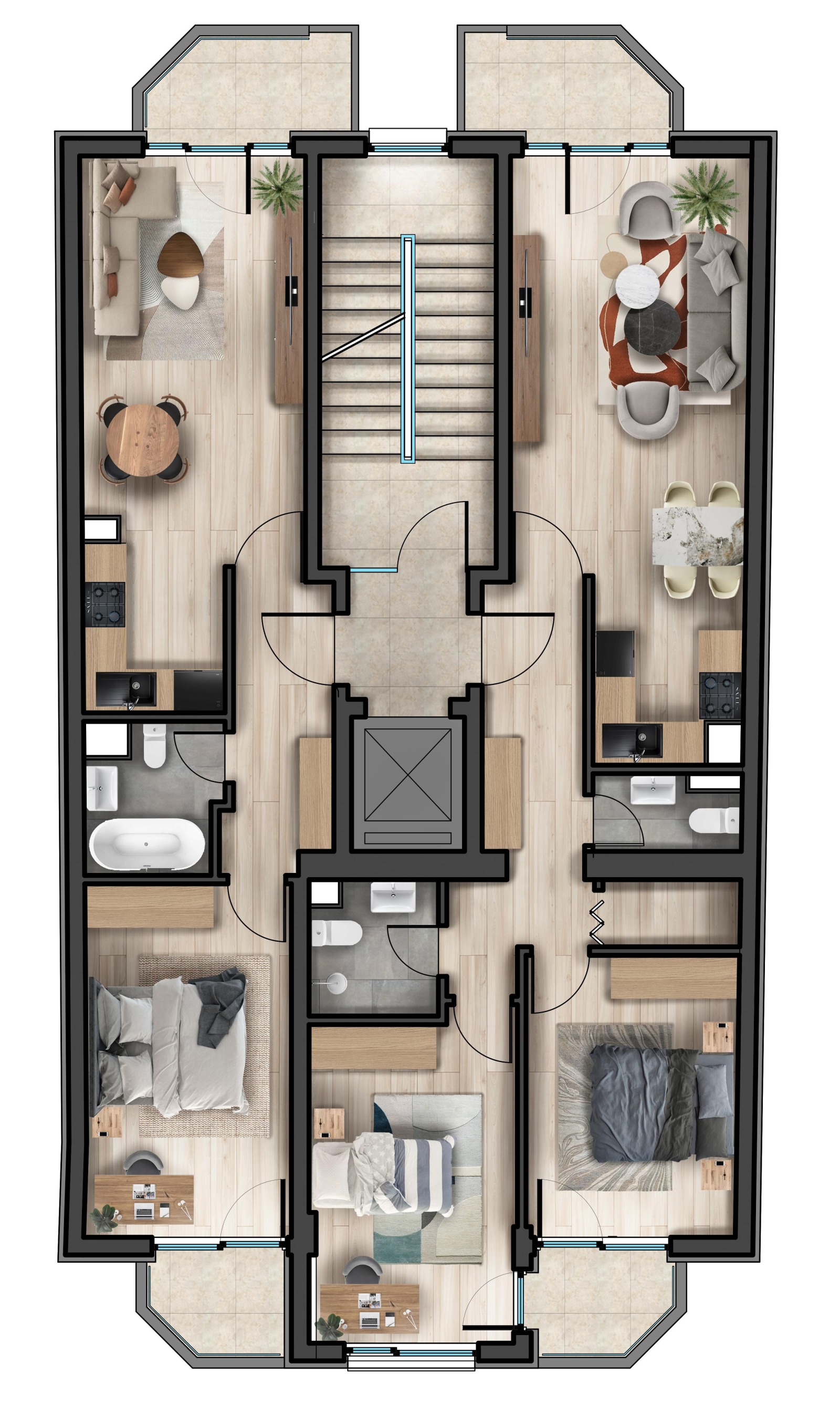 Разпределение: входно антре, кухненски бокс с хол и трапезария, две спални, баня с тоалетна и тераса