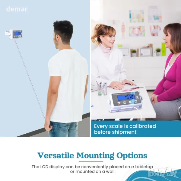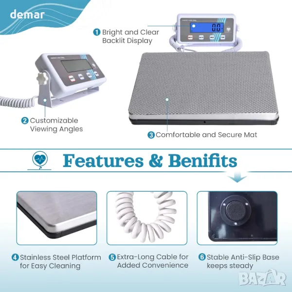 Тази медицинска везна разполага с по-широка, неплъзгаща се платформа за подобрена стабилност, което я прави по-безопасна за потребители с наднормено тегло и възрастни хора. Осигурява прецизни измервания на теглото с високочувствителен сензор, идеален за домашна, клинична, фитнес зала и употреба в здравеопазването. Отделният LCD дисплей позволява лесно четене на нивото на очите, особено полезно за хора с проблеми с мобилността. Той включва множество функции като претегляне, тара, задържане и калибриране, с безпроблемно превключване на единици между паундове и килограми. Лек и преносим, той работи с батерии или DC адаптер за продължителна употреба, въпреки че батериите не са включени.