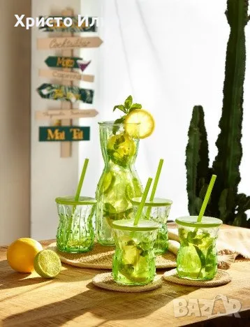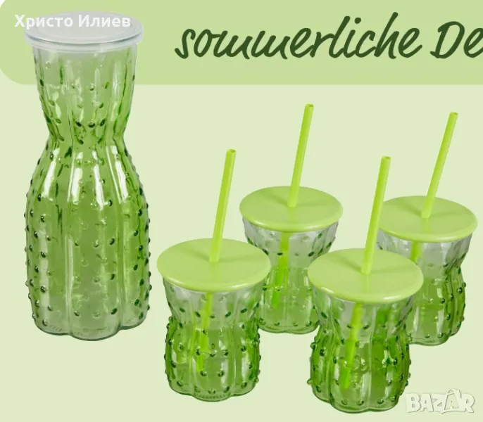 Кана с чаши Стъклен комплект гарафа с 4 чаши и сламки идеални за лимонада коктейли, снимка 1 - Сервизи - 49483094 Кана с чаши Стъклен комплект гарафа с 4 чаши и сламки идеални за лимонада коктейли, снимка 2 - Сервизи - 49483094 Кана с чаши Стъклен комплект гарафа с 4 чаши и сламки идеални за лимонада коктейли, снимка 3 - Сервизи - 49483094 1/3