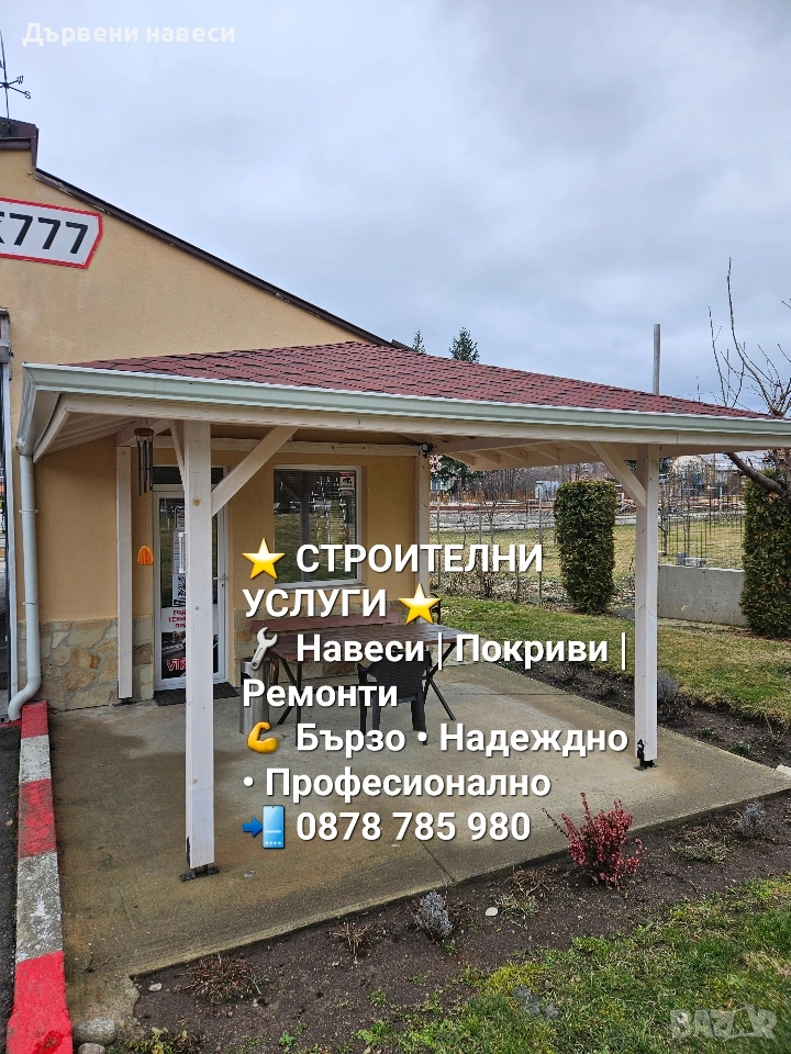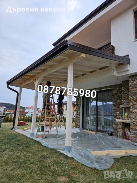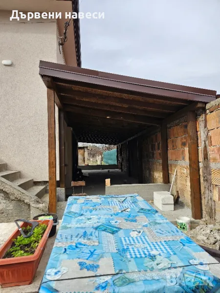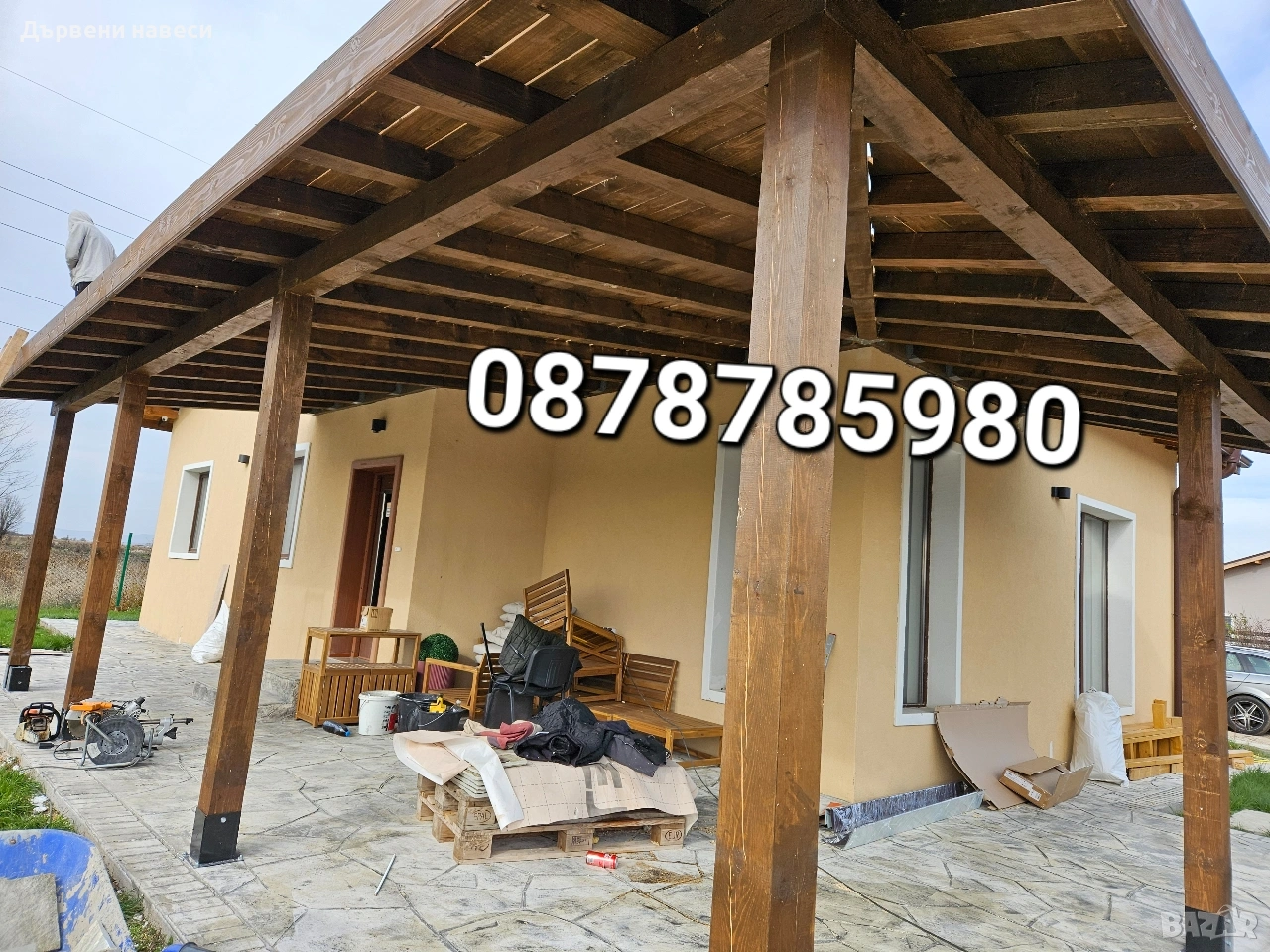 дървени навеси, беседки, барбекюта и гаражи, като целият дървен материал се шлайфа и импенгрира. Гаранция, договор направа на всякакви навеси от дърво, навеси на тераси, гаражни навеси за автомобили, навеси за летни кухни, барбекю и зимни градини от дърво