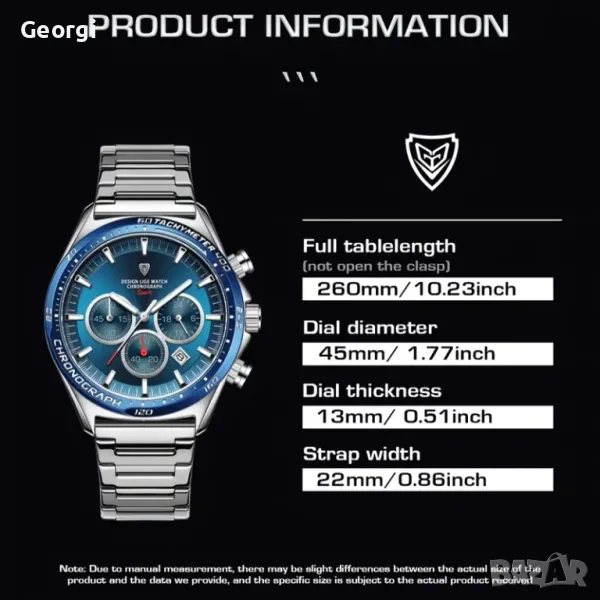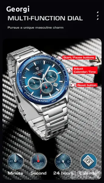 Притежаващ стилно, спортно и динамично излъчване подходящо за всяко време с метално син отблясък на циферблатът.