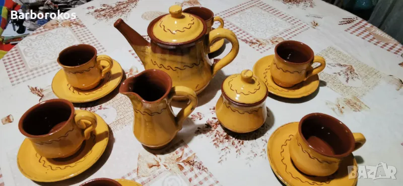 Керамичен сервиз за кафе, ръчна изработка материал червена глина. 1бр. Каничка за кафе, 6 бр чаши, 1бр каничка за мляко и 1 бр захарник.