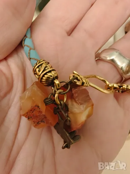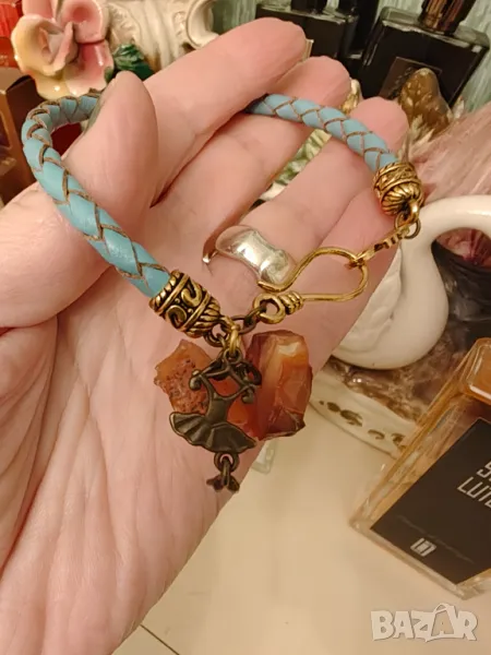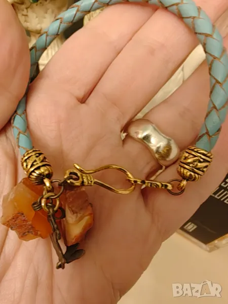 Изцяло ръчна изработка с рядък камък канела вид рядък гранат наречена Хесонит.Гривната е от естествена кожа сребърни елементи 800 с позлата и месингов талисман .Размер 20 см Продава се с благотворителна цел.Крайна цена