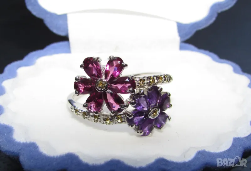 925 сребърен пръстен с аметист и гранат, другите камъни са жълт сапфир. Халка 9/59.5/19.5 → Обява 49485836