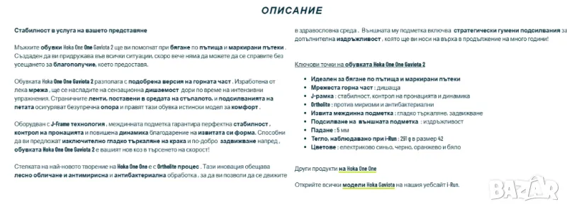 Красиви , модерни , много леки и удобни . Gaviota позволява на бегачи, които търсят стабилна обувка, най-сетне да се отърсят от ограниченията на традиционните поддържащи обувки. Първокласна обувка за стабилност, Gaviota 2 разполага с превъзходно омекотяване заедно с дизайна HOKA ONE ONE® J-Frame™. HOKA J-Frame™ осигурява опора и защита, докато насочва крака ви без използването на твърди и непримирими материали. Изработена от инженерна мрежа, горната част предлага превъзходна дишаемост по време на всяко бягане. Gaviota ви дава безкрайна поддръжка за безброй мили.