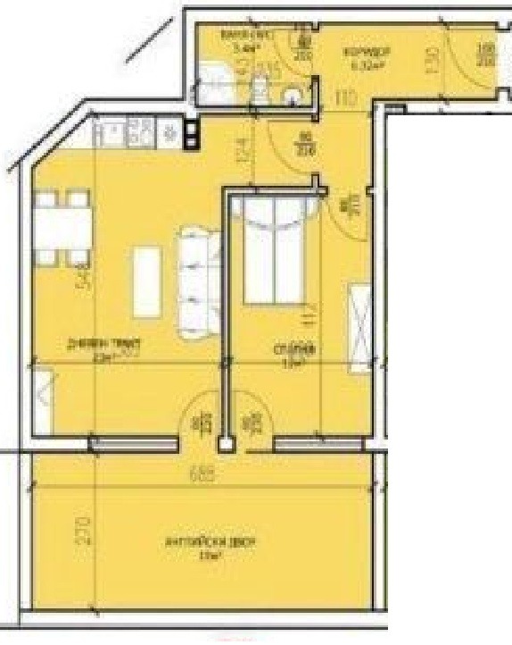 Имота има жилищна площ от 53,00 кв.м. и обща площ от 61,32 кв.м., прилежащ голям английски двор с площ около 21 кв.м.
