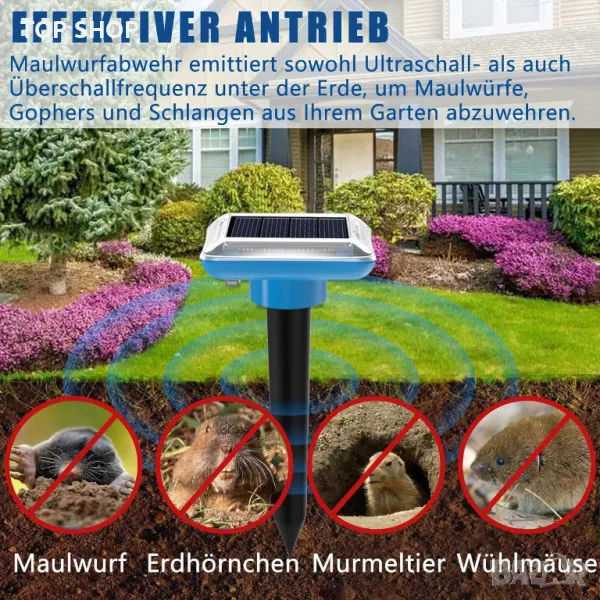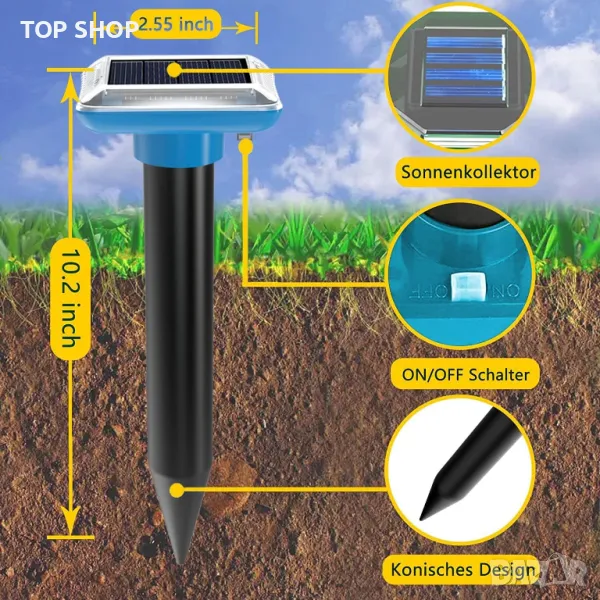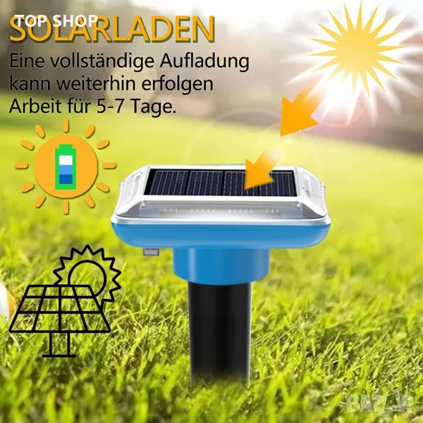 Ключови думи: Соларен репелент, ултразвуков репелент, водоустойчив, къртици, мравки, змии, мишки, гофери, екологичен, слънчев панел.