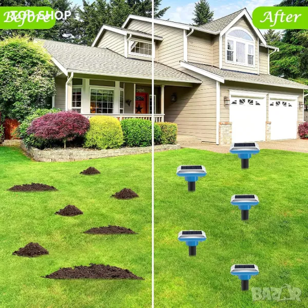Ултразвуковият репелер за вредители предлага широка защита за външни площи като тревни площи, дворове и градини срещу къртици, известни със своята чувствителност към шум и вибрации. Работи чрез излъчване на нискочестотни импулси на всеки 20 секунди, създавайки среда, неподходяща за къртици, и ефективно предотвратява щети.