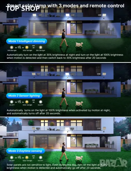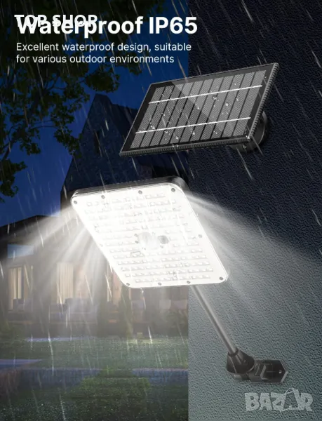 Изпитайте непрекъснато осветление с външно LED осветление за сигурност, включващо 6000mAh акумулаторна батерия, предлагаща 8 часа непрекъсната употреба след само 6 часа бързо зареждане. USB кабелът за зареждане осигурява захранване дори при облачно време. Персонализирайте осветлението си с три цветни температури и регулируеми нива на яркост, лесно управлявани чрез дистанционно. С рейтинг IP65 за устойчивост на атмосферни влияния, той издържа на дъжд или блясък. Три режима за засичане на движение осигуряват персонализирани нива на яркост за енергийна ефективност и сигурност. Опциите за инсталиране без усилие включват монтиране на стена или използване на куки за гъвкаво поставяне. Забележка: Когато соларният панел засече светлина или е свързан към източник на захранване, той автоматично влиза в режим на зареждане и светлината не свети. Покриването на соларния панел е необходимо, за да работи светлината нормално.