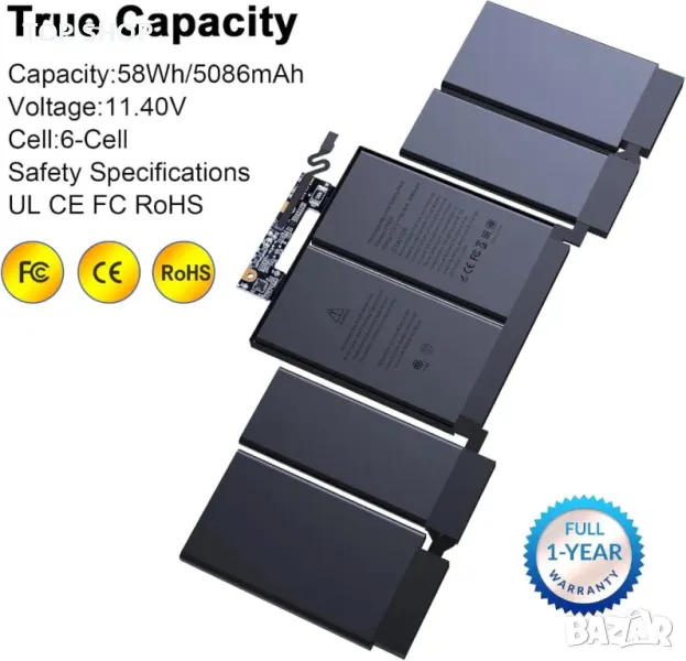 Висококачествена резервна батерия с капацитет 11.41V / 5086mAh / 58Wh, предлагаща около 500 цикъла на зареждане. Проектиран със защита срещу свръхток, презареждане, прекомерно разреждане и контрол на температурата за издръжливост и безопасност. Съвместим с модели MacBook Pro 13-inch Touch Bar (2018-2019), включително A1989, A2251 и съответните EMC номера и номера на части (A1964, 020-02497, 616-00419). Сертифицирани от CE, FCC и RoHS, гарантиращи надеждност и безопасност чрез строг контрол на качеството преди изпращане.