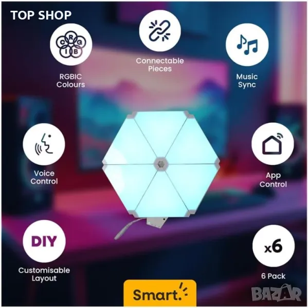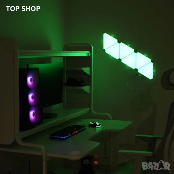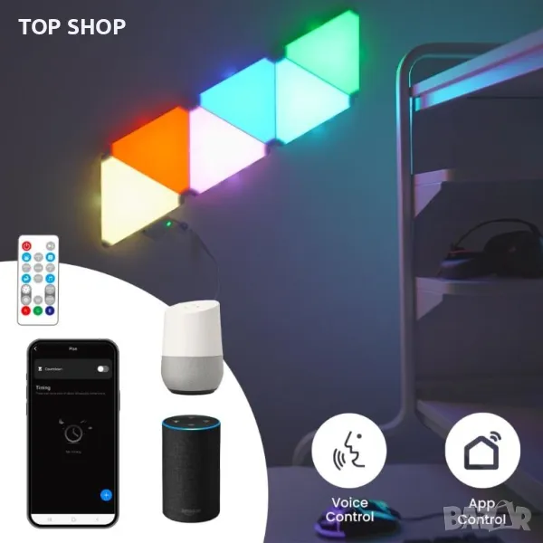 Панелите с неонова светлина RGBIC показват няколко цвята едновременно, създавайки живи, динамични шарки. Съвместими с Amazon Alexa и Google Home, те позволяват гласово управление за мощност, яркост и промени в цвета. Функцията за синхронизиране на музика настройва светлините към околните звуци, подобрявайки игрите, партитата и домашните забавления. Функция таймер позволява планиране чрез приложението smart life или дистанционното управление. Лесни за инсталиране, панелите се свързват с доставените конектори и се интегрират с приложението smart life за безпроблемна настройка.
