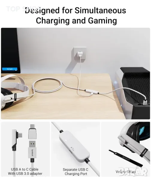 Кабелът за свързване 2-в-1 Syntech 2025 е проектиран за безпроблемна съвместимост с Meta Quest 3S/3/2, осигурявайки стабилна USB 3.0 връзка с компютър при едновременно бързо зареждане. Той включва USB-C към A адаптер за гъвкава свързаност и поддържа скорости на трансфер на данни от 1,9–3,2 Gbps по цялата си дължина от 5 метра, осигурявайки минимално забавяне. С усъвършенстван чип за зареждане 2025, той осигурява до 18 W PD зареждане и автоматично превключва към бавно зареждане при 65% батерия, за да удължи живота. Създаден за издръжливост, той има трислойна защита срещу вода, корозия и електрически утечки, със сигурна велкро лента за предотвратяване на прекъсвания. За оптимална производителност използвайте с PD/QC бързи зарядни устройства и актуализирайте фърмуера.
