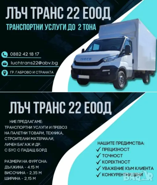 предлага транспортни услуги в гр.Габрово и страната със собствен камион Iveco daily до 3,5 т., фургон , падащ борд .