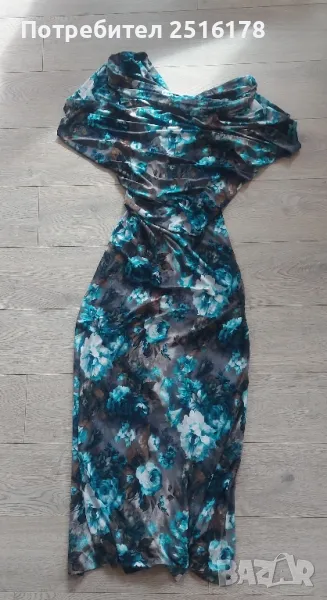 Роклята е наистина уникална, защото дължината и начина, по който да снои могат да се регулират от този, който я носи. От много приятна, еластична,немачкаща се материя.Роклята е с полу-гол гръб, като може едното или и двете рамена също да са голи.Много приятно подчертава ханша и бедрата.При интерес ще изпратя снимки как стои.Обличана 2 пъти на 2 сватби,на които смея да твърдя беше в центъра на вниманието! По етикет е S, но става и за М,тъй като материята е доста еластична. Идеална за всеки официален повод!