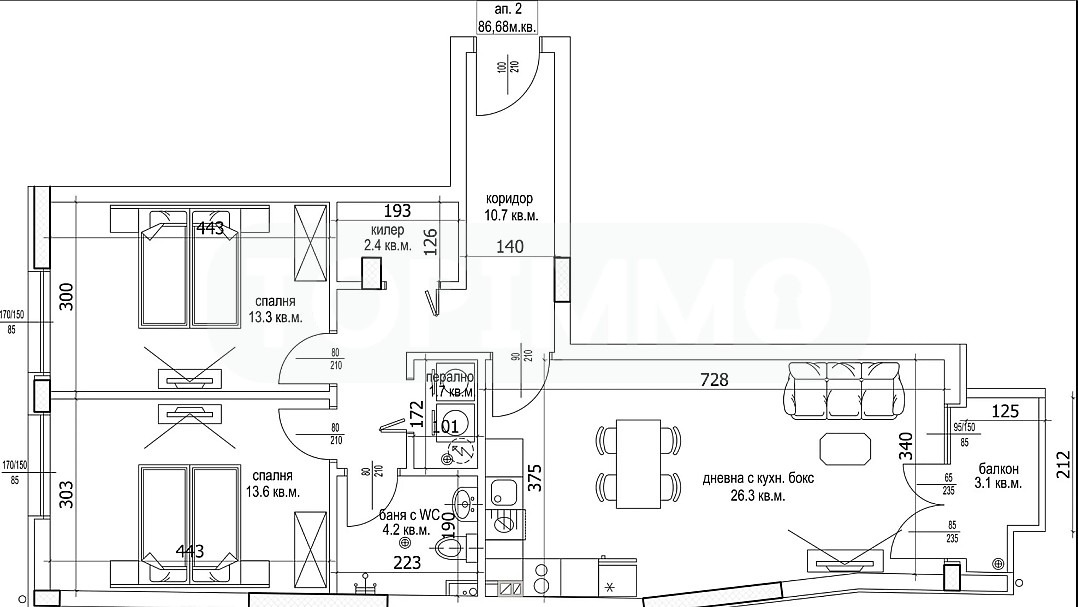 Апартаментът е разположен на 2-ри етаж в осеметажна сграда, на площ от 99,03 кв.м. са разпределени коридор, дневна с кухненска част, 2 спални, баня с тоалетна, килер и балкон. Издава се в степен на завършеност по БДС.