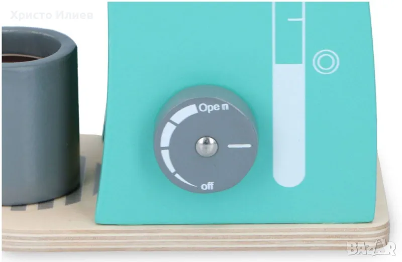 Комплектът се състои от общо 5 части и включва дървена чаша, както и три различни „капсули“ кафе, които децата да сервират на своите плюшени играчки. Кафемашината е с модерен дизайн и е изработена от качествена дървесина.