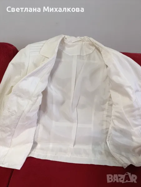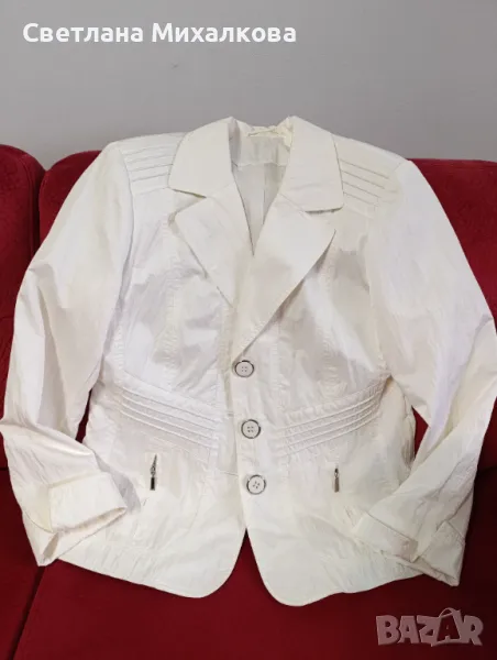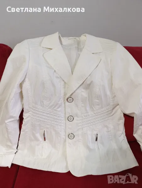Продавам дамско сако за лято,бяло на цвят с хастар с размерите раменете 43 см, гръдната обиколка 48 см, талията 46 см, дължина на ръкава 62 см, дължина на сакото 63 см
