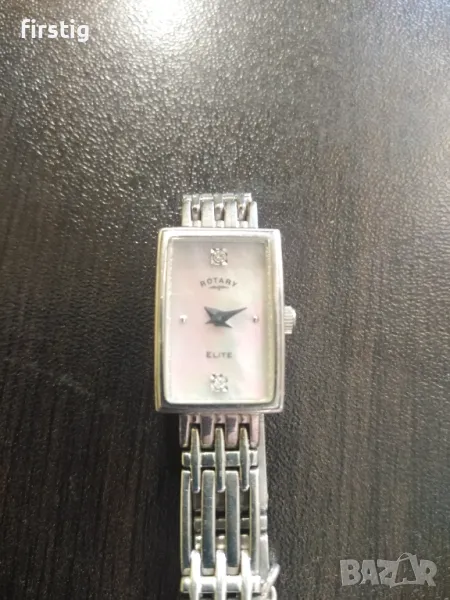 Дамски Сребърен 925 Часовник Rotary Elite с два диаманта в отлично работно състояние. Швейцарски кварцов механизъм с нова батерия, каса от сребро проба 925 с размери 13 на 19 мм, сребърен капак 925, оригинална коронка, оригинален седефен циферблат с два диаманта на 12 и 6 часа, сребърна верижка проба 925, грамаж на часовника 31 гр.