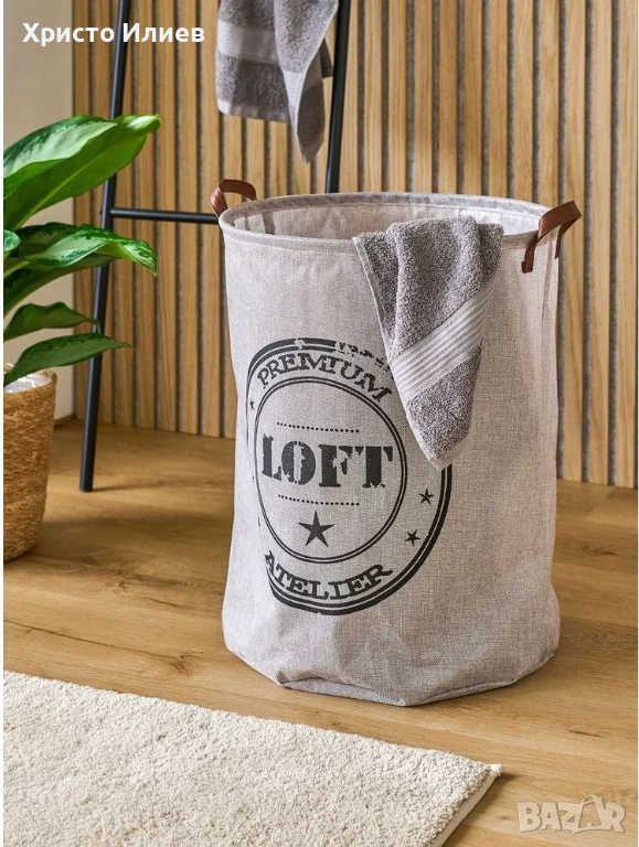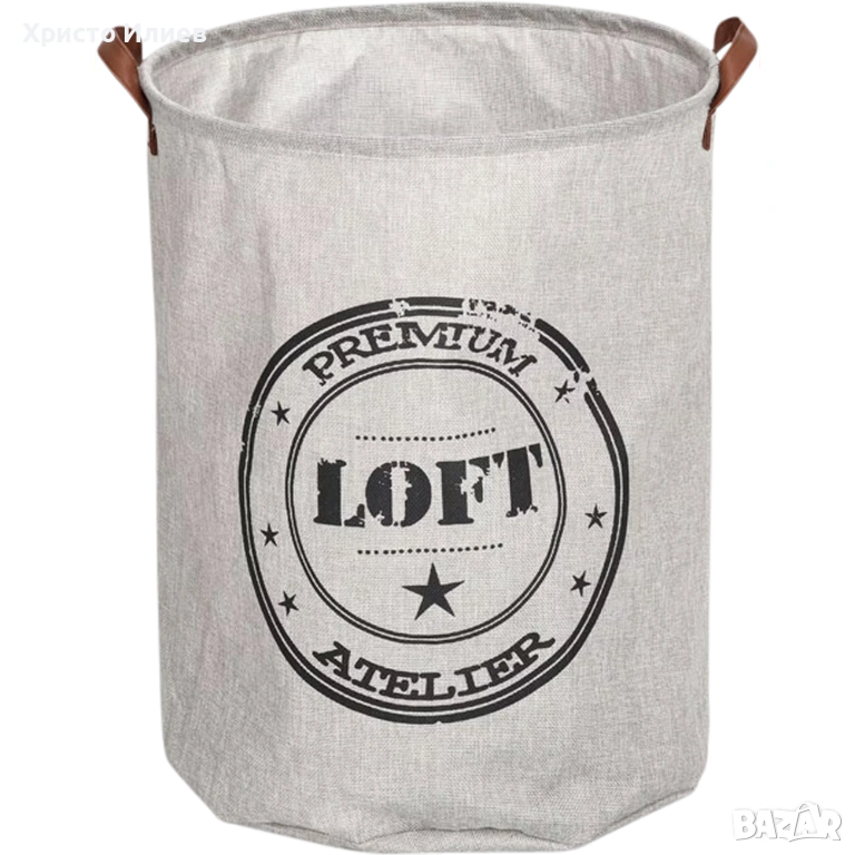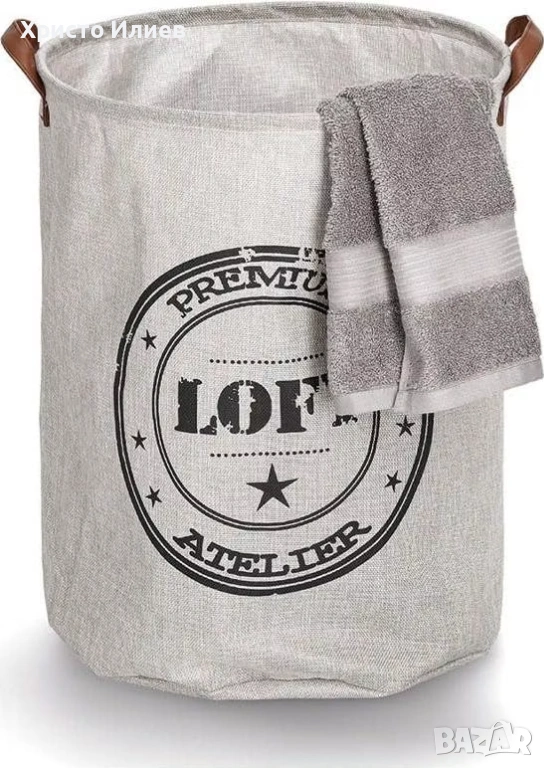 Този кръгъл кош за пране впечатлява с модерния си лофт дизайн. Допълвайки модерния му вид, той разполага с две странични дръжки, изработени от кафява изкуствена кожа. Кошът е преносим и лесен за боравене.