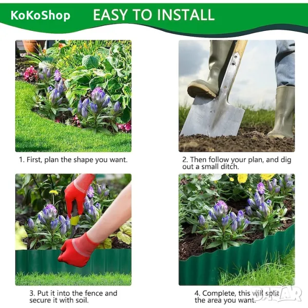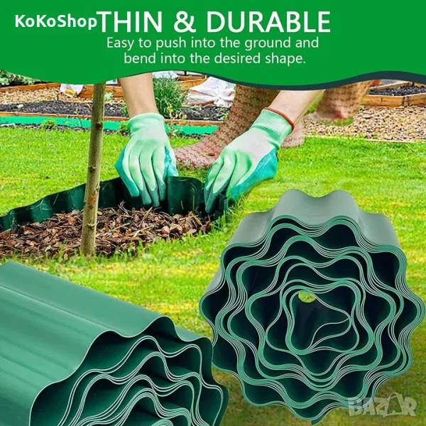Пластмасова лента за отделяне на тревата от различни видове цветни лехи, настилки и алеи в двора и градината. С нея лесно ще създадете ясни граници между тревни площи и цветни зони, придавайки естетика и подреденост на вашата градина.