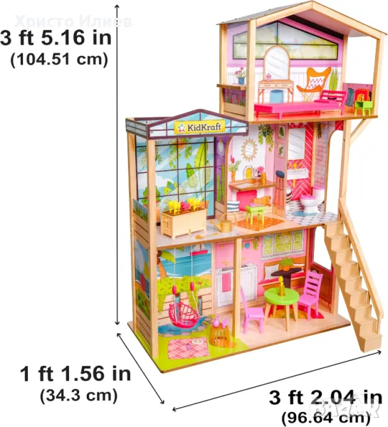 Не само въображението на децата ще се развихри, но и любовта им към растенията ще покълне от играта с куклената къща KidKraft Blooming Spring Garden. Тази дървена къща за кукли е над три фута висока и има три нива за най-доброто приключение за отглеждане. Всяка мебел отразява бохемския стил, особено решетъчният хамак, който виси от тавана. Децата могат да се преструват, че поливат цветарника в кутия и да гледат как цветята „изскачат“, докато растат. Дървеното стълбище е подвижно, така че куклите имат достъп до всяка стая от всеки ъгъл. Спалнята на последния етаж е мечтана зона за релакс, докато тоалетната отдолу има рафт, който се простира от стената, за да даде място за поставяне на ваза с цветя. Всяко пътуване през стаите на Blooming Spring Garden Dollhouse ще запази грижата за природата изобилна и весела в сърцата и умовете на момчета и момичета.