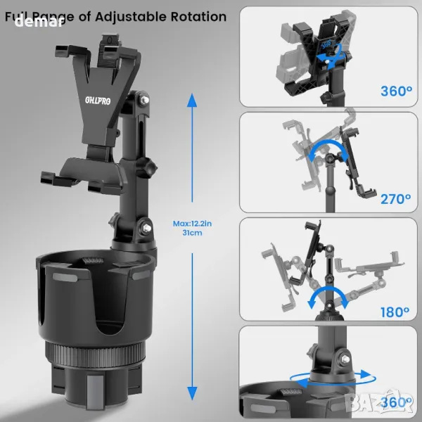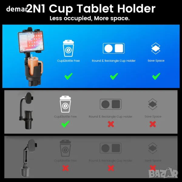 Тази стойка за таблет с поставка за чаша 2 в 1 съчетава сигурна поставка за таблет с функционална поставка за чаша, като увеличава пространството във вашия автомобил. Той разполага с въртене на 360° и регулируемо телескопично рамо, което побира 7"-11" таблети за използване със свободни ръце. Меката силиконова подплата предотвратява надраскване, докато отворената скоба позволява лесен достъп за зареждане. Основата с въртящо се заключване осигурява стабилно прилягане във всеки автомобилен държач за чаша, а механизмът за бързо освобождаване с един бутон позволява лесно монтиране и премахване. Проектиран за издръжливост, той издържа на екстремни температури, което го прави идеален за пътувания, работни камиони и ежедневна употреба.