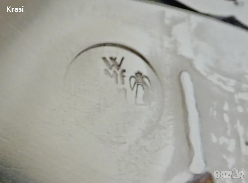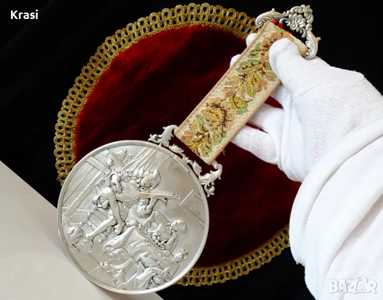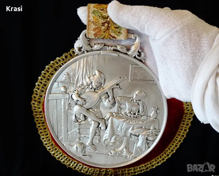 Пано,плакет,майсторска ръчна изработка от 95% калай и 5% сребро.Маркирано с инициалите на световно известната марка WMF.Представлява прецизна релефна репродукция на една от емблематечните картини „Лютнист” на холандския художник живописец Hendrick Martenzoon Sorg от 17 век в бароков стил.Има сърмена окачалка за стена.Височина 30 см.,диаметър 14 см.,тегло 200 гр.