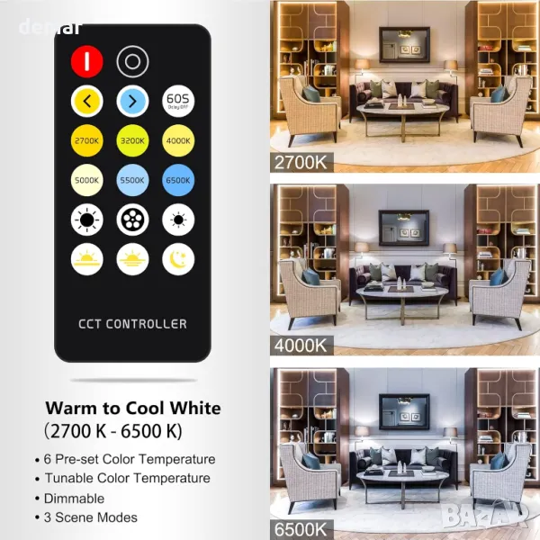 Димируема бяла COB LED лента с регулируема цветова температура от топло до студено бяло (2700K-6500K) за различни настроения и задачи. Разполага с 3040 светодиода за ярко, равномерно осветление. Може лесно да се реже на всеки 26 мм за персонализирани дължини и да се свързва за продължителна употреба. Предлага 8 нива на яркост, регулируеми чрез включеното дистанционно управление. Лесна инсталация plug-and-play с DC захранващ адаптер и самозалепваща се подложка за сигурно поставяне върху плоски повърхности. Идеален за декорация на дома, създавайки топла и атмосферна атмосфера във всекидневни, спални, кухни, бюра, гърбове за телевизори, барове и ресторанти. Подходящ за използване на закрито.