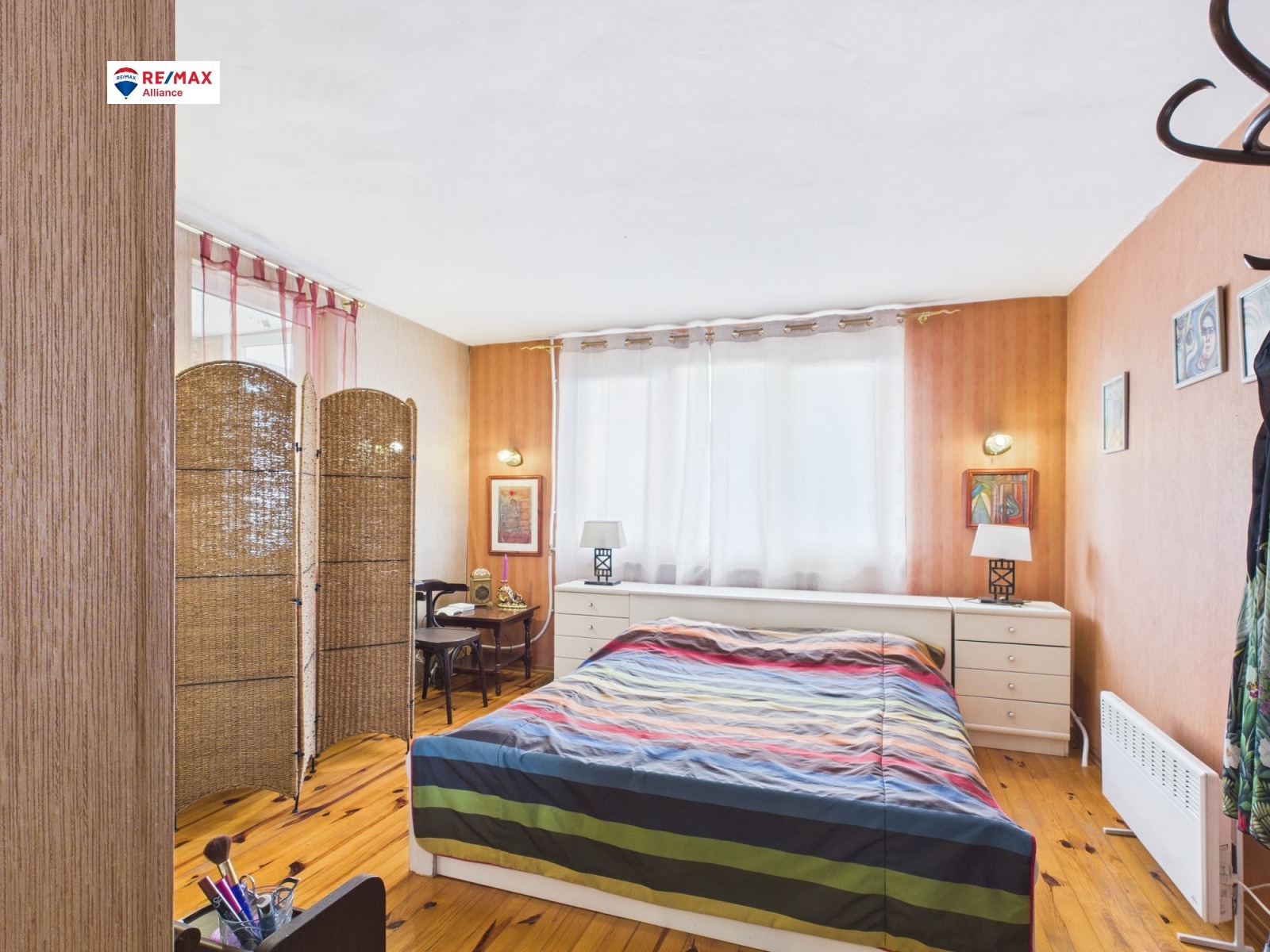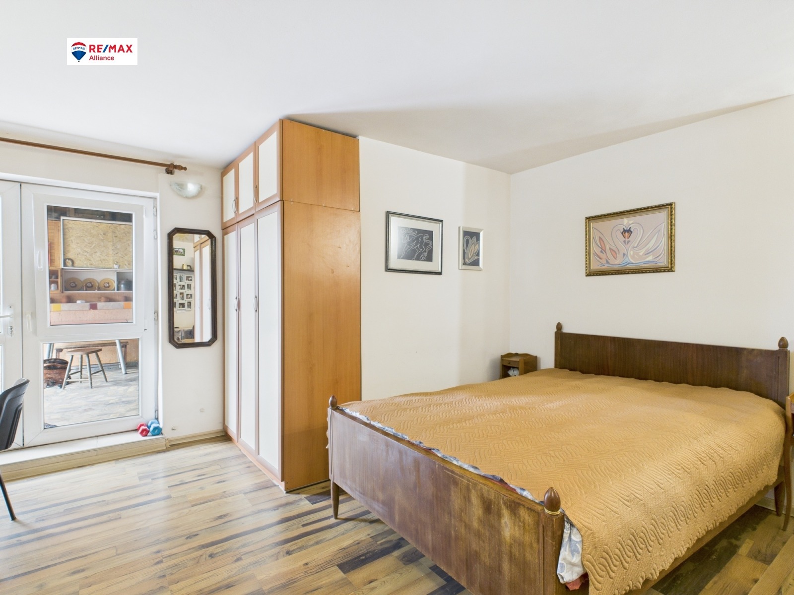 - обширна спалня с огромен телевизор, два гардероба, бюро и маса за хранене, плъзгаща врата към банята и към кухнята.