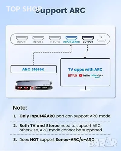 Забележка: За оптимална производителност се препоръчва използването на сертифицирани HDMI 4K кабели с дължина под 10 фута/3 метра. Превключвателят не поддържа конфигурация 1 in 4 out или Sonos-ARC/e-ARC.