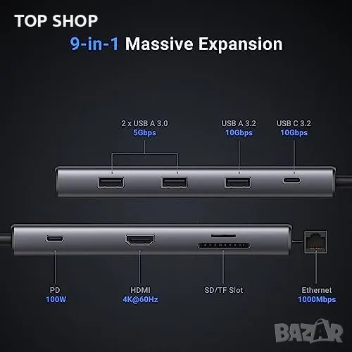 Предоставя множество възможности за свързване, включително 4K@60Hz HDMI, 100W USB-C PD, 10Gbps USB-C и USB-A портове за данни, два 5Gbps USB-A порта за данни, Gigabit Ethernet и слотове за SD/TF карти.
