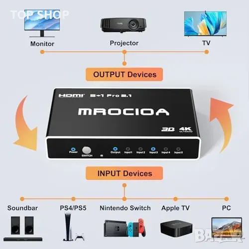 HDMI 2.1 превключвател с 5 входа и 1 изход