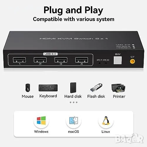 Позволява на 2 компютъра да споделят 1 монитор и 4 устройства USB 2.0.