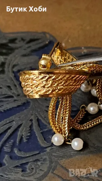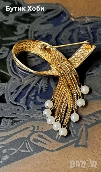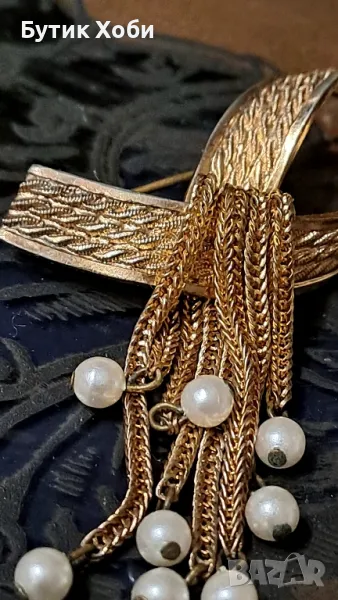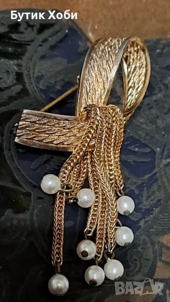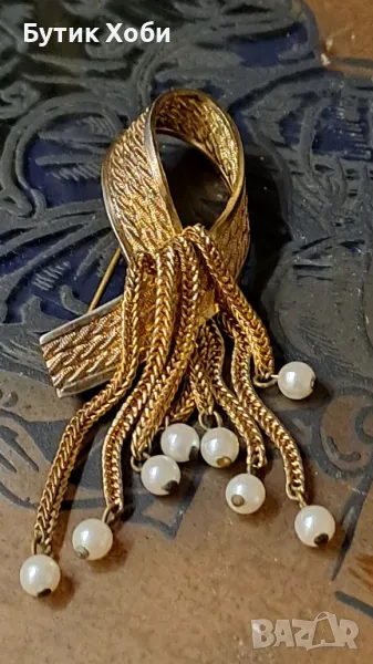Прекрасна колекционерска брошка от 60 - те години с изкуствени перли. Много популярна е през този период като форма и дизайн. Подобни модели и в тази комбинация са били произвеждани от Dior и Lisner - типични синджирчета, браширана повърхност, позлата и перли. В добро колекционерско състояние, няма налични маркировки. Размери - 6×2см.