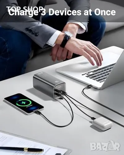 Голям капацитет: Зарежда MacBook Air 1.1 пъти, iPhone 15 14 - 3.8 пъти и Samsung S23 - 3.2 пъти.