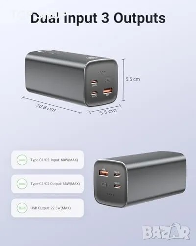 3 изхода за зареждане: Позволява зареждане на 3 устройства едновременно; Type-C 1/2 с максимален изход 65W.