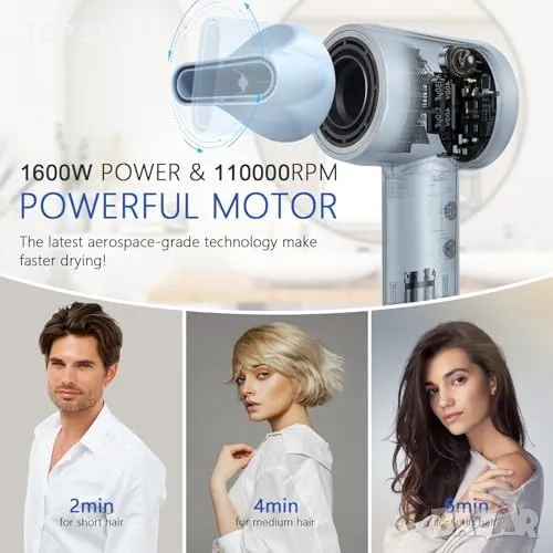 Бързо сушене с 1600W и 110 000 об/мин