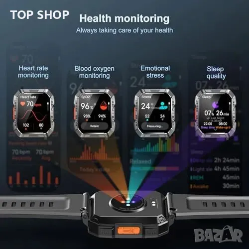 Здравен мониторинг: Проследяване на сърдечен ритъм, кислород в кръвта, стрес и сън.