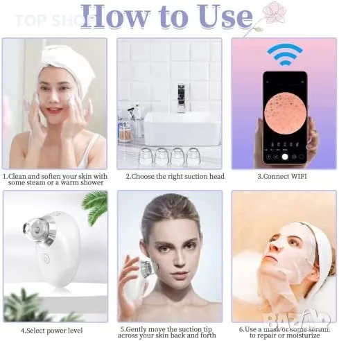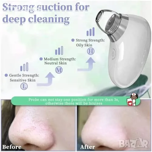 3 нива на засмукване и 4 смукателни глави за различни типове кожа и области на лицето