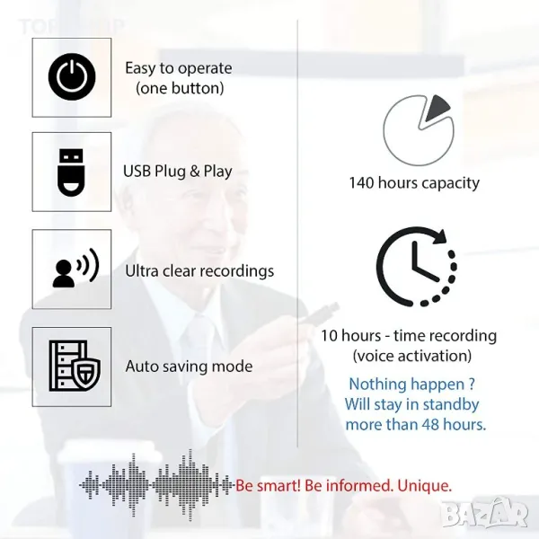 Има вграден електронен синтезатор за обработка на звук в реално време и дори ако има фонов шум, дискусиите и гласовете ще бъдат усилени, така че записът ще бъде изключително ясен независимо от разстоянието или средата.