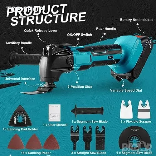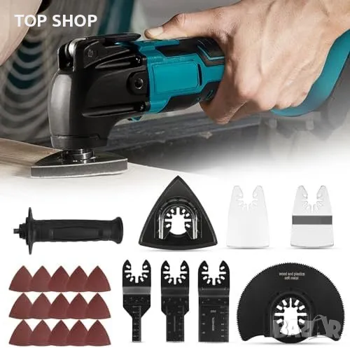 Многофункционални аксесоари: Включва 125мм кръгъл трион, потапящ трион, триъгълен шлайфащ блок и три вида шкурка.