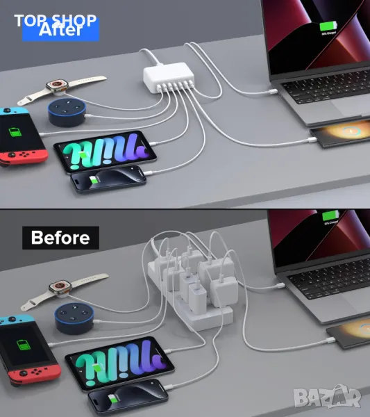Изпитайте несравнима възможност за зареждане със 180W зарядно устройство Zomvan USB C, включващо 7 порта за зареждане на множество устройства едновременно, включително съвместимост с USB-C и USB-A. Той поддържа широк набор от устройства като iPhone 15 до iPhone 8, iPad Pro/Air/Mini, AirPods Pro, MacBook Pro/Air, серия Samsung Galaxy от S23 до S20, серия Note и др. Превъзходният USB-C порт на зарядното устройство предлага бързо зареждане от 65 W, идеално за бързо захранване на лаптопи. Неговият компактен дизайн увеличава максимално пространството на бюрото, позволявайки зареждане на 7 устройства без претрупване. Пакетът включва зарядно устройство, захранващ кабел от 5 фута, ръководство за добре дошли.