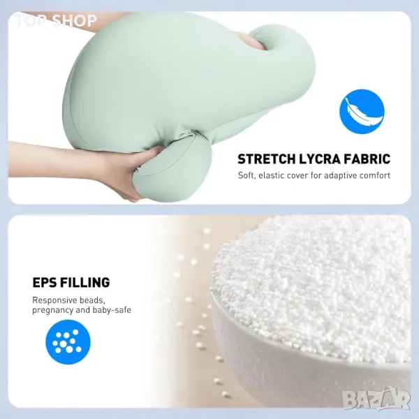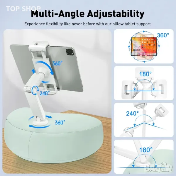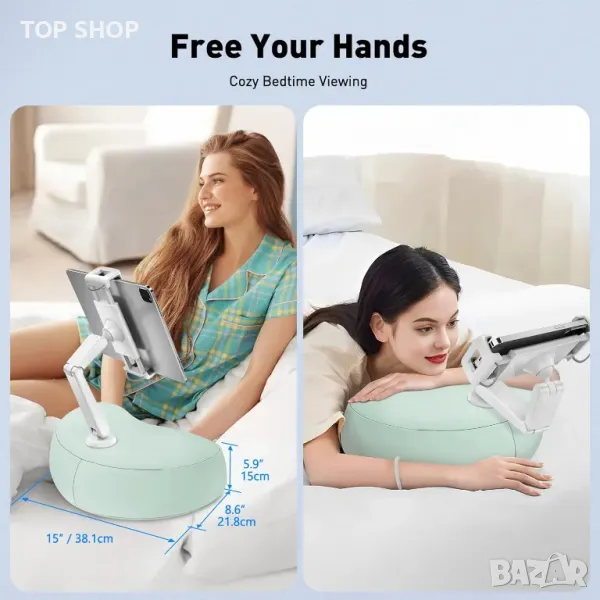 стойка - възглавница предлага универсална употреба върху легла, дивани, столове, коли или самолети, което я прави идеална за гледане, четене, учене или работа навсякъде. Той разполага с универсална съвместимост, подходящ за устройства от 4,7" до 12,9", със завъртане на 360°, обръщане на скобата на 360° и сгъваемо на 180° рамо за оптимални ъгли на гледане. Ергономичният, патентован дизайн осигурява регулируеми ъгли и омекотяване за комфорт при продължителна употреба. Изработен от мека, щадяща кожата материя от ликра и напълнен с гранули от EPS пяна, той е едновременно удобен и лесен за почистване със своя сменяем и перещ се калъф.