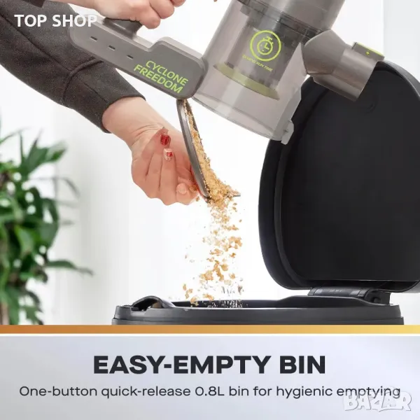 безжична прахосмукачка, включваща светлина за тъмни ъгли и настройки с две скорости за персонализирана работа върху различни повърхности. Сменяемите четки и приставки го правят универсален за труднодостъпни места, докато миещият се филтър и лесно изпразващият се резервоар за прах от 0,8 литра осигуряват лесна поддръжка. Монтираната на стена скоба предлага удобно съхранение, а индикаторите за батерията ви информират, всичко това в лек дизайн за лесно маневриране.