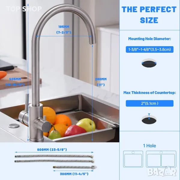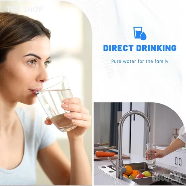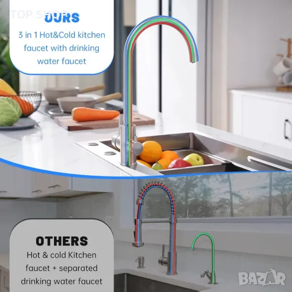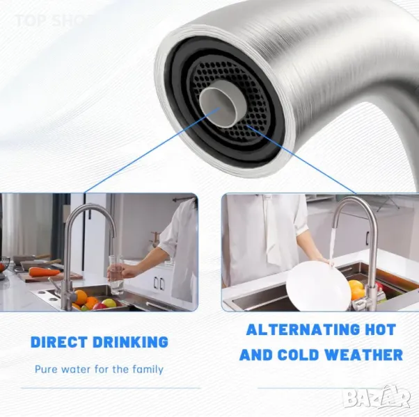 Кухненски кран 3 в 1 с двоен лост за топла/студена вода и отделна функция за филтрирана питейна вода. Независим дизайн с двоен чучур предотвратява смесването, докато формата на гъши врат осигурява допълнително пространство. Изработен от устойчива на корозия неръждаема стомана SUS304 с издръжлив керамичен клапан за предотвратяване на течове. Разполага с пенообразувател от ABS за по-гладък воден поток, намалявайки отпадъците с 30%, и PEX маркуч за безопасна питейна вода. Елиминира необходимостта от допълнителен кран, спестявайки място и пари. Обхватът на въртене на 360° е подходящ за единични или двойни мивки, а лесният монтаж не изисква водопроводчик.